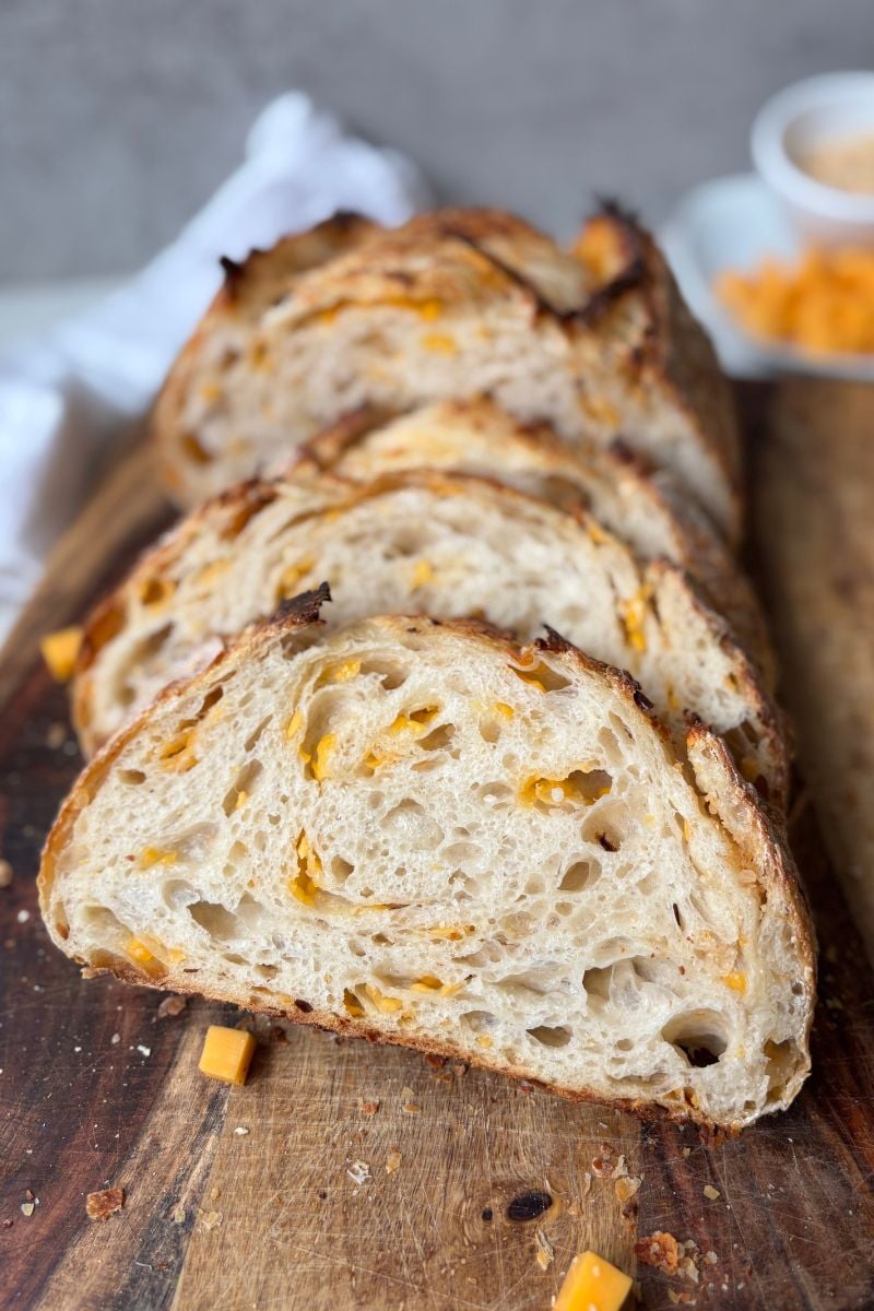 Both work, but when and how you add the cheese matters. Shredded cheddar works best when added during stretch and folds. If you plan to add the cheese during shaping or lamination, finely diced or cubed cheddar is a better option since it helps prevent separation and large holes in the crumb.