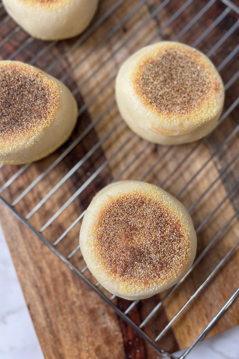 Yes! This recipe makes 8 standard English muffins, but you can divide the dough into 10–12 smaller muffins or 6 larger ones. Just adjust the cook time slightly (smaller muffins will need a minute less per side).